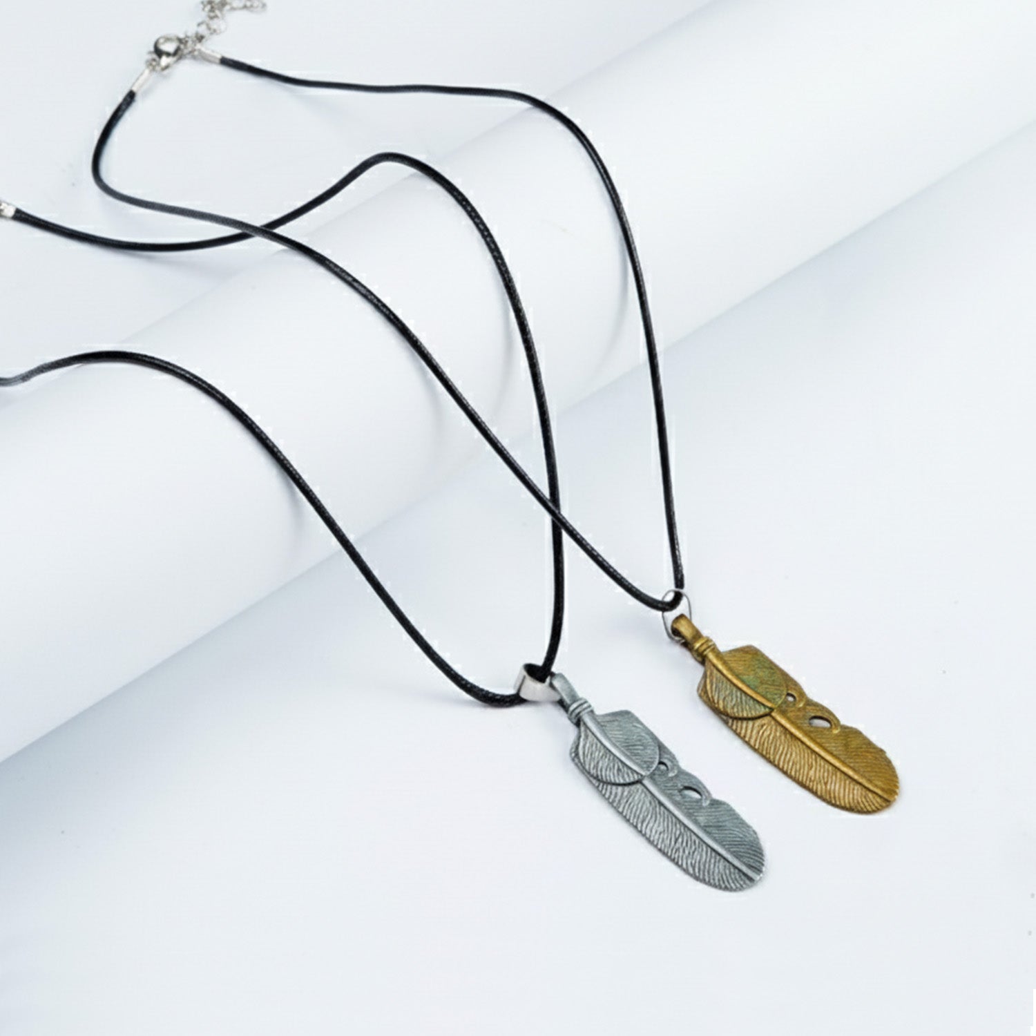 A stunning pair of Flex Feather Necklaces in silver and gold, designed to elevate any outfit.Made with stainless steel for durability and long-lasting shine.Featuring a sleek black rope for a modern, versatile look.
